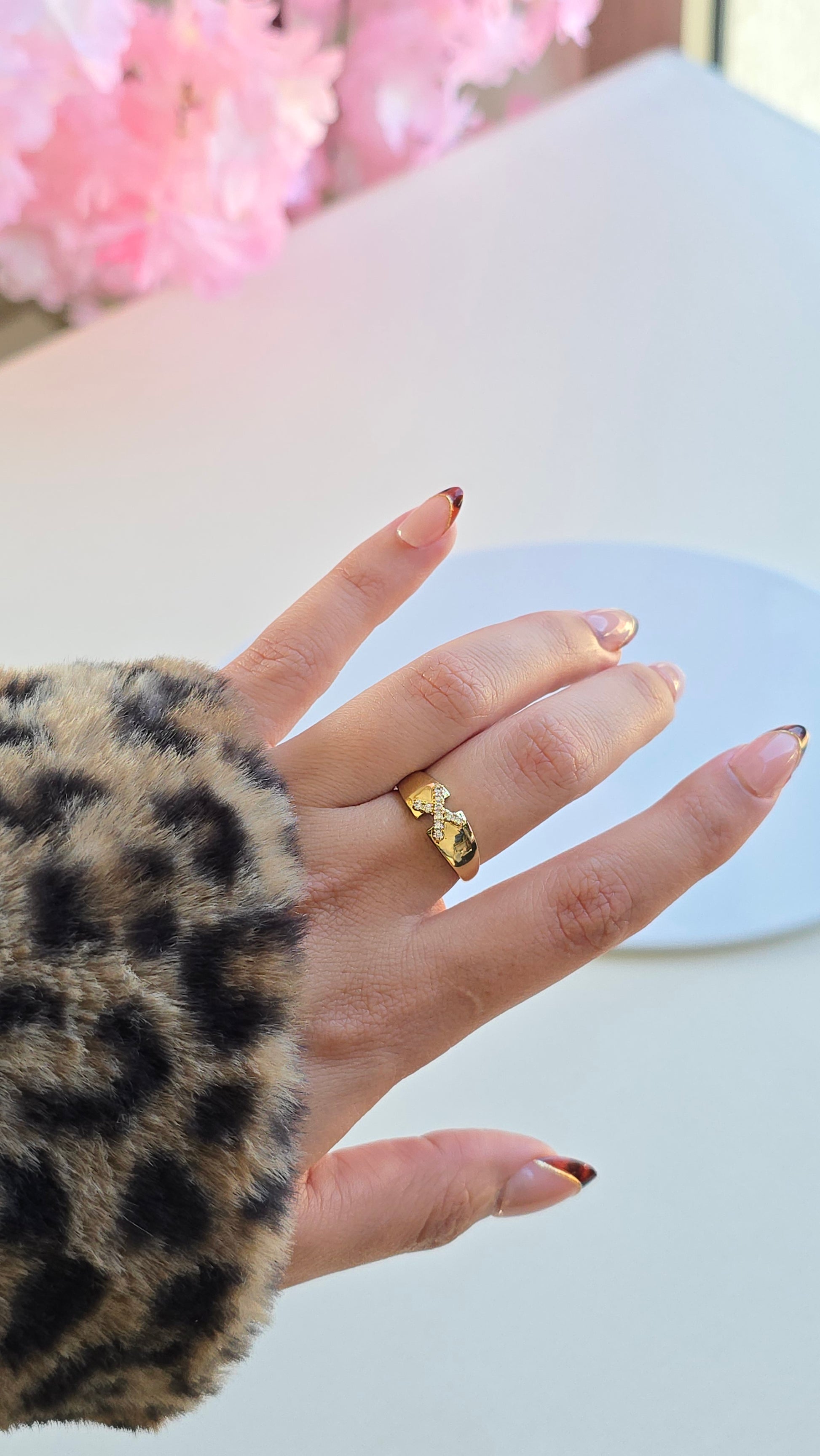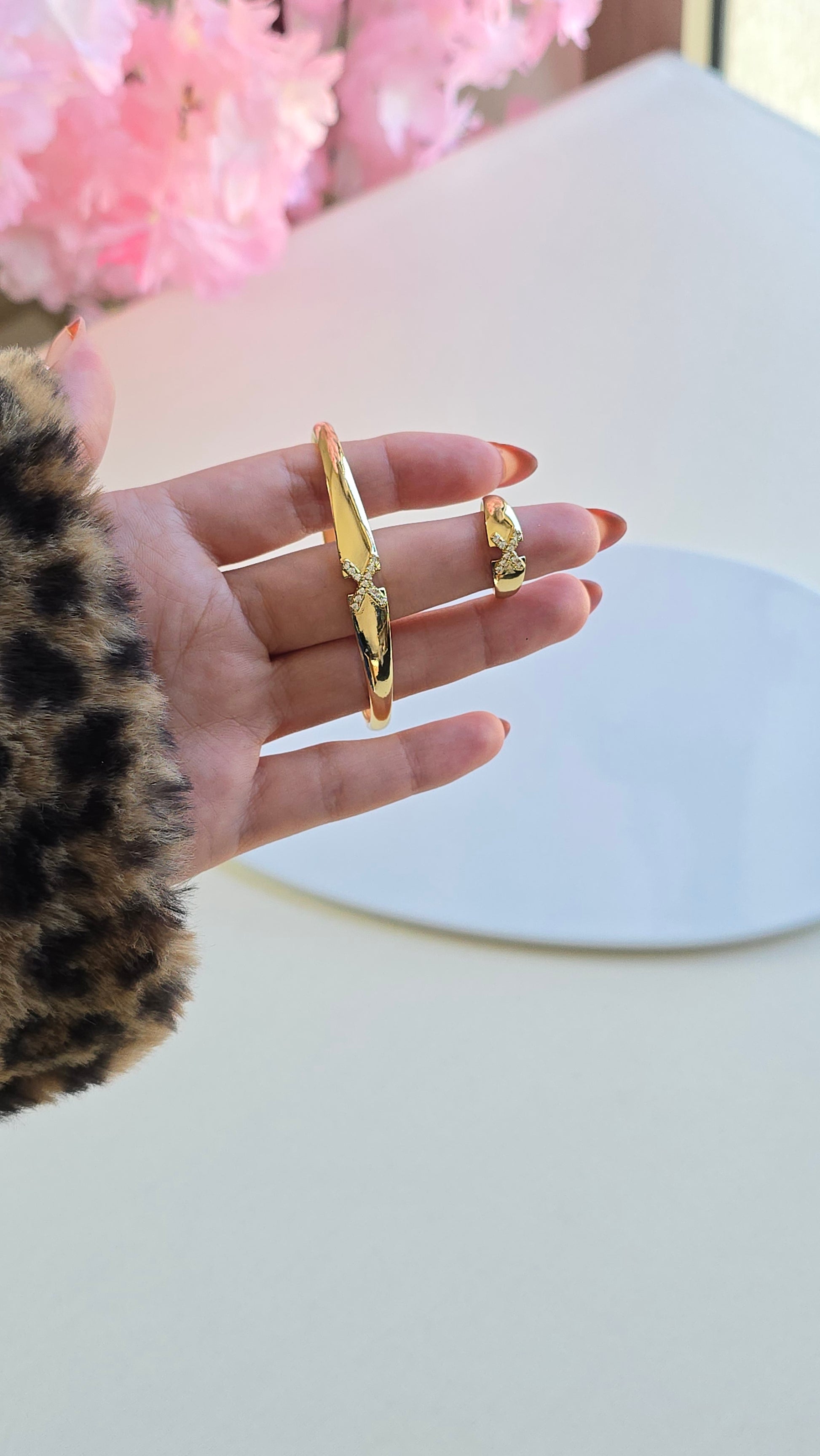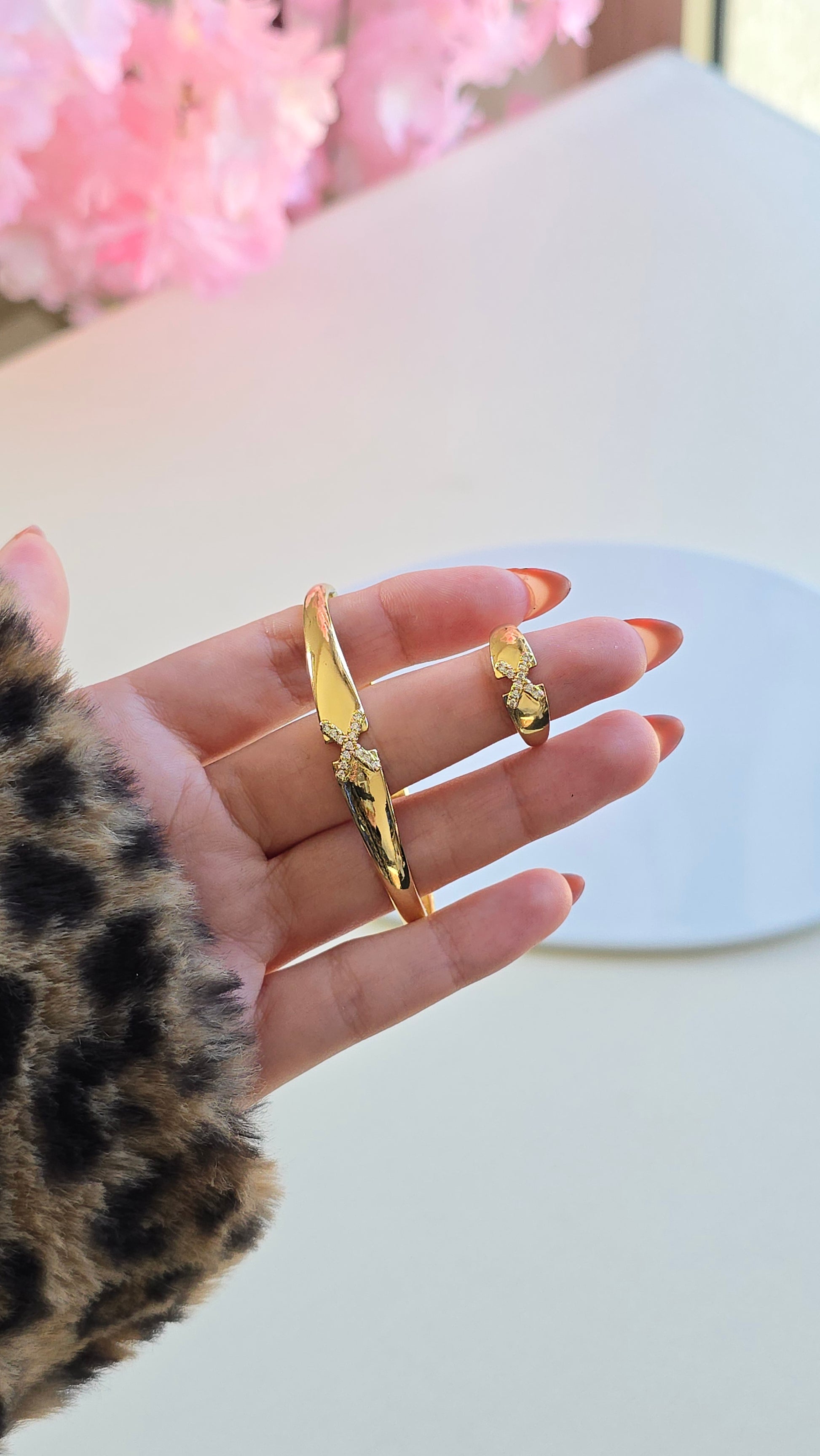 Set inoxydable, composé d’une bague et d’un bracelet au design d’or moderne ciselé.