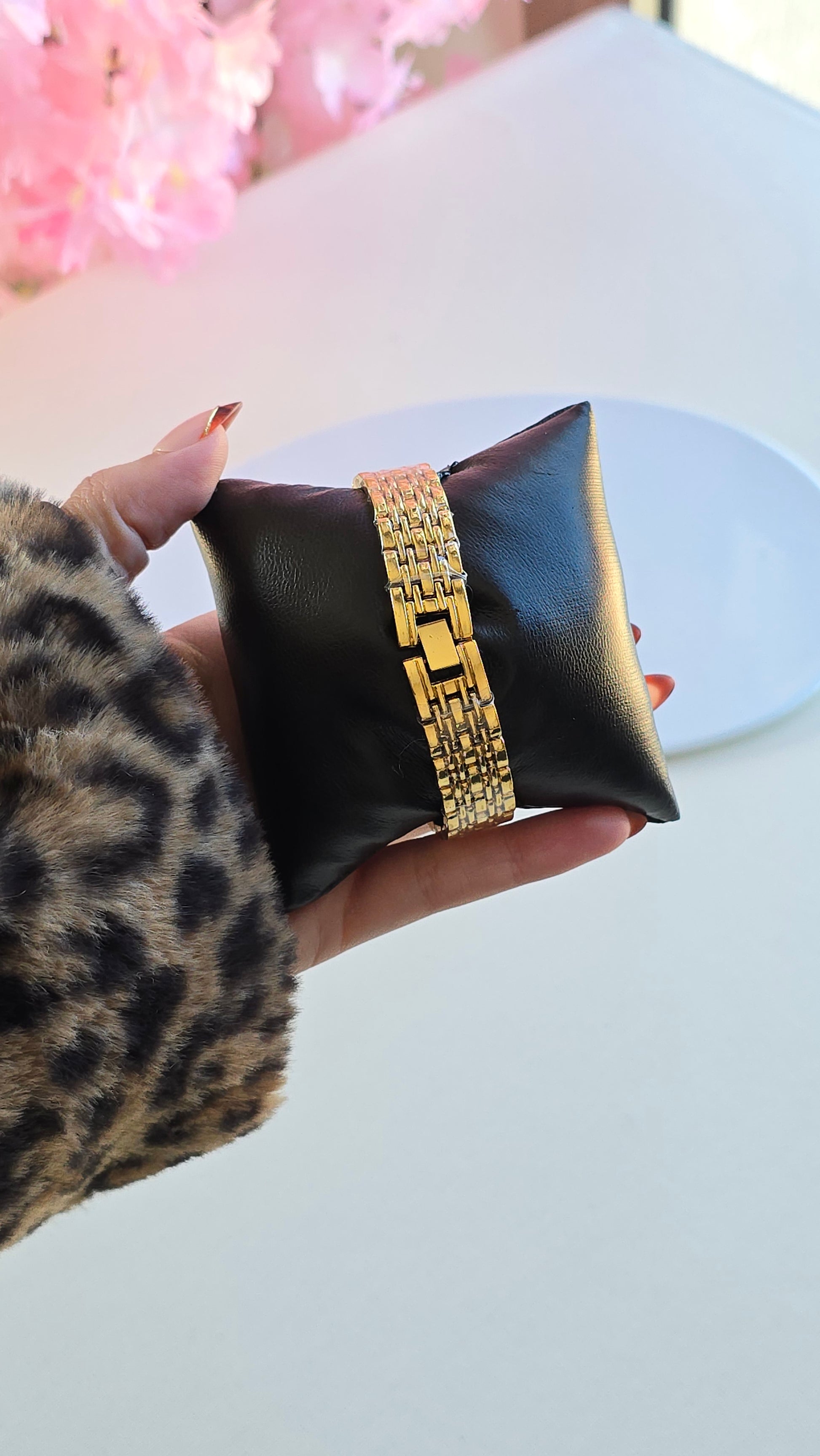 Montre dorée au design rectangulaire, inspirée des modèles de luxe.